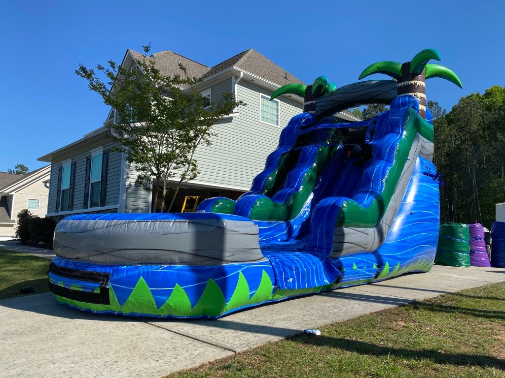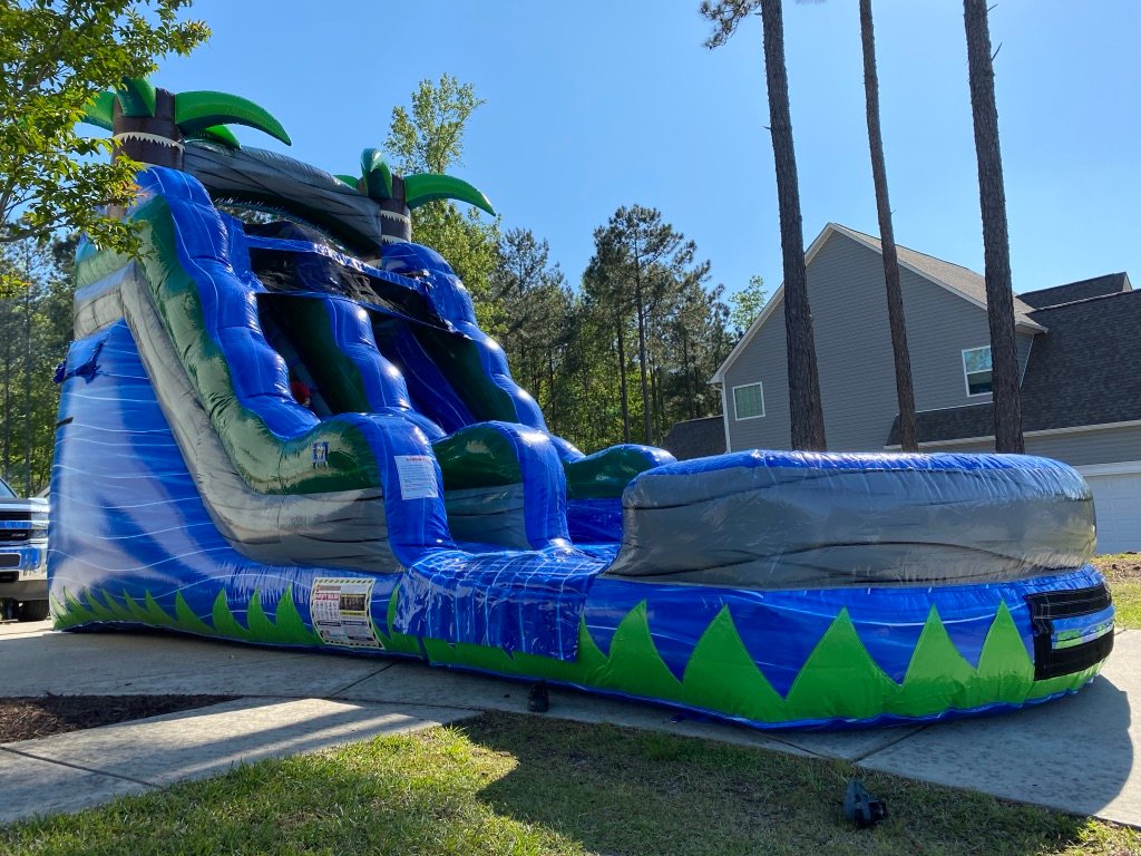DescriptionThe “Blue Crush” water slide is perfect for your next event. It features a tropical themed 3D environment that your guests will love. Children climb the inflatable slide on the left of the unit, and slide down the 15 foot drop into the inflatable pool below.