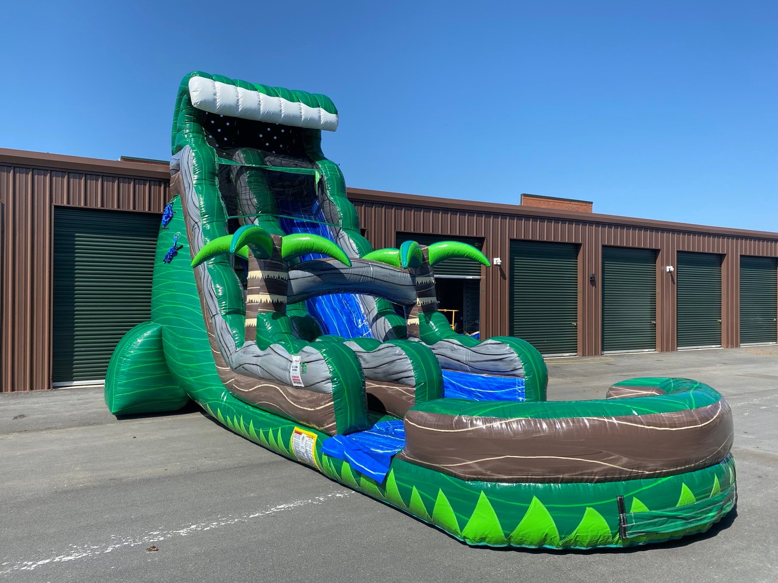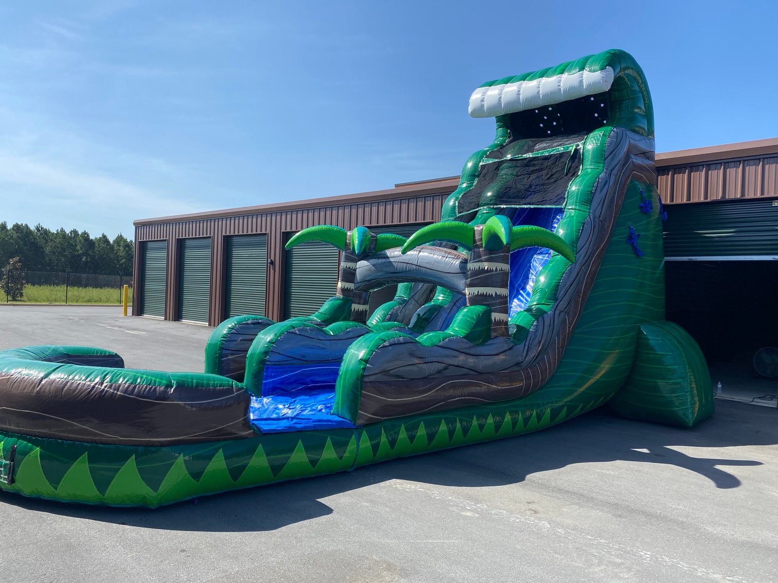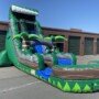 DescriptionThis 22 foot “Emerald Crush Tsunami” water slide is perfect for your next event. It features a tropical themed 3D environment that your guests will love. Children climb the inflatable slide on the left of the unit, and slide down the 22 foot drop into the inflatable pool below.