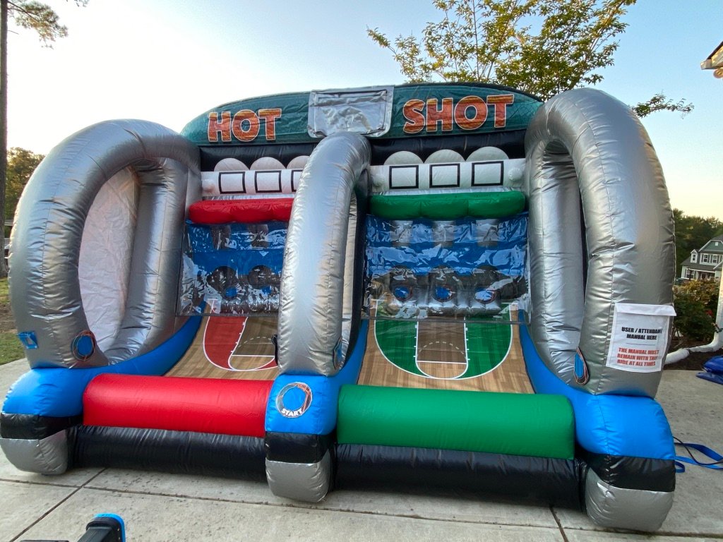 DescriptionShoot fast! Go head to head with this sports inflatable to see who can shoot the most baskets. This includes 6 basketballs with 6 hoops side by side. A ramp sends the balls right back down so competitors can reach fast and make as many attempts as they can to beat their opponent! Teams can also relay for the best all-around score – compete against a timer and see how your score stacks up. Get ready to rumble! This shootout is sure to see lots of all-star action at your event!