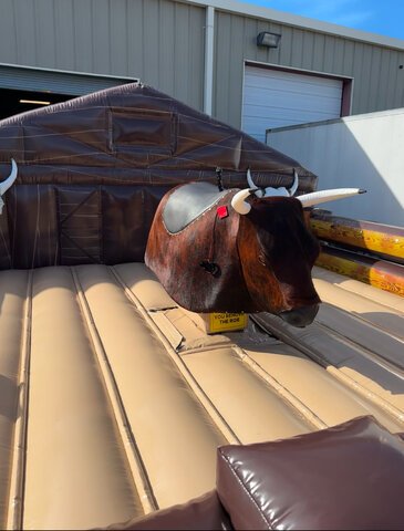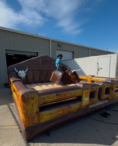 Our mechanical bulls are one of the safest mechanical bulls in the industry. Our mechanical bull is a FULL SIZE MECHANICAL BULL, while the trend with most mechanical bull rental companies is to go with a smaller machine that has a round inflatable ring. We like our riders to be able to have a great experience on a quality machine. Our mechanical bull has body roll and more front-end drop, to make it feel more like the real thing. The operator at our control box regulates our bull’s Buck-and-Spin speed, as well as spin direction. The mechanical bull has the capabilities of starting rides very slowly, and can be advanced to speeds according to a rider’s about to be thrown. Our goal is to have the rider have fun and be excited to ride again. If a rider is nervous we can start out slow and the rider does not have to be thrown off. For the more adventurous we can increase the thrill of the ride.